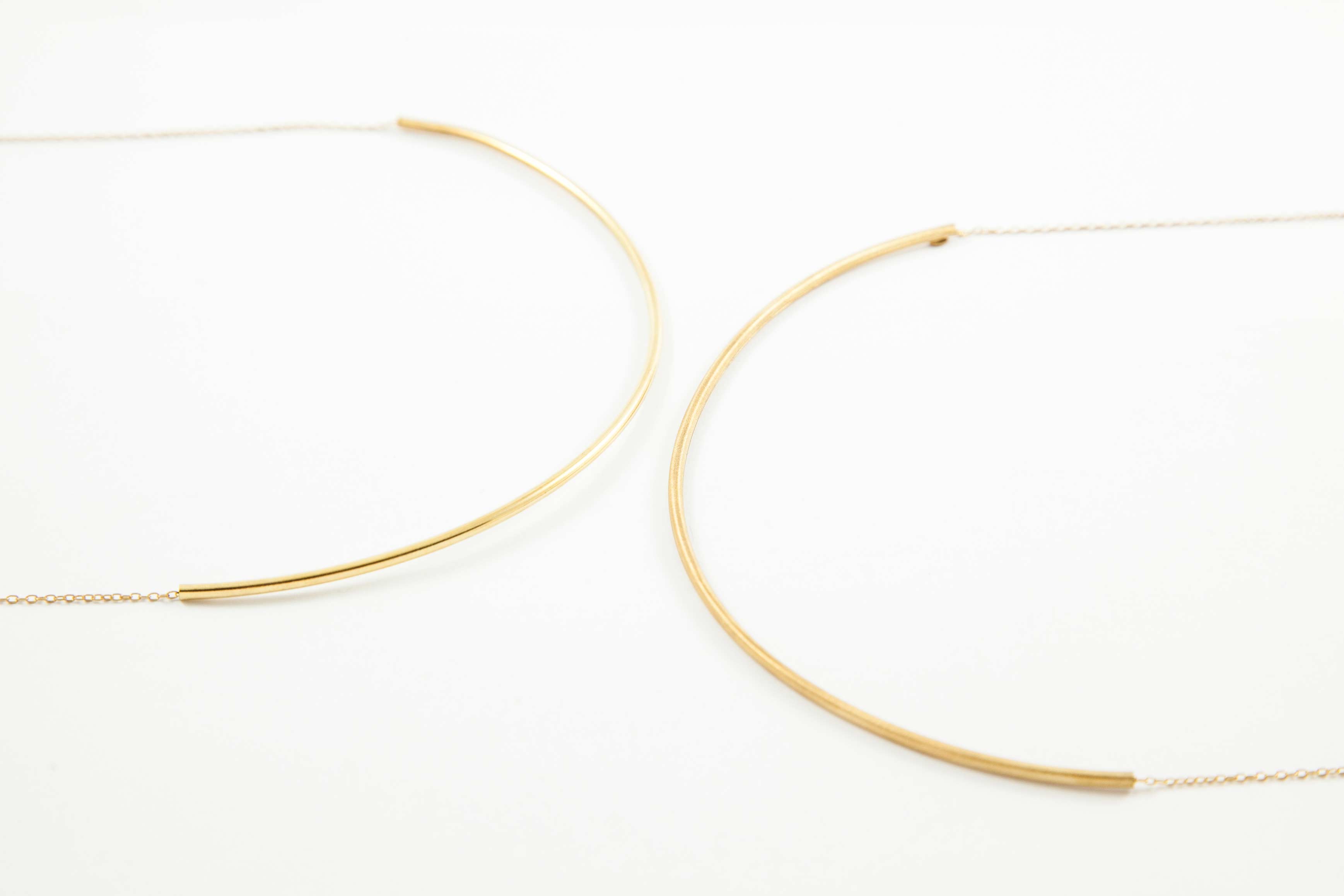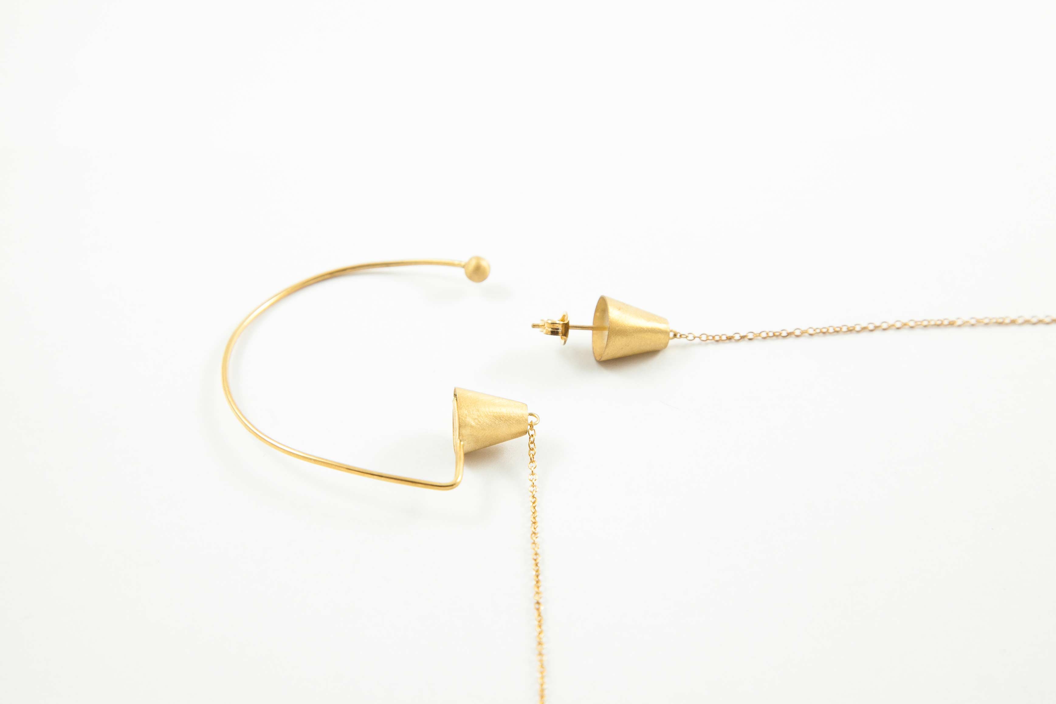 Gli orecchini, diversi tra loro, sono formati entrambi da due piccoli tronchi di cono, che rimandano poeticamente alla forma del “telefono senza fili”, collegati tra loro sempre da una lunga catena saldata ai due estremi.